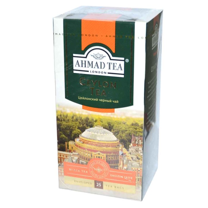 Чай черный Ahmad Tea Ceylon Tea байховый 25пак*2г 50г - пакетированный, высокогорный, истинно цейлонский чай из верхних листочков. При заваривании приобретает светло-коричневый цвет с красным оттенком, умеренную крепость и утонченный классический вкус плантационного чая с легкой горчинкой. Чашечка этого терпкого напитка подарит вам бодрость в любое время дня. При желании можно добавить сахар, мед, лимон, специи или молоко. Рекомендуем заливать крутым кипятком и настаивать 3-4 минуты. Чем дольше вы завариваете пакетик, тем крепче и темнее получится чай.