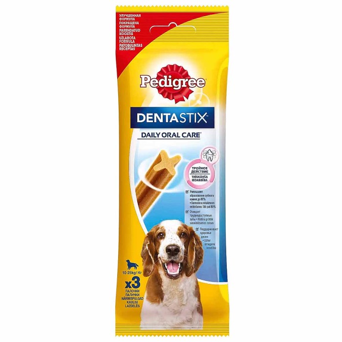 Лакомство по уходу за зубами Pedigree Denta Stix для Собак Средних Пород - это уникальная возможность ухаживать за зубами питомца во время еды. Клинически доказано, что ежедневное использование Pedigree® Denta Stix снижает уровень образования зубного камня до 80%, предотвращает риск развития заболеваний полости рта. Собакам тоже нужно чистить зубы каждый день.