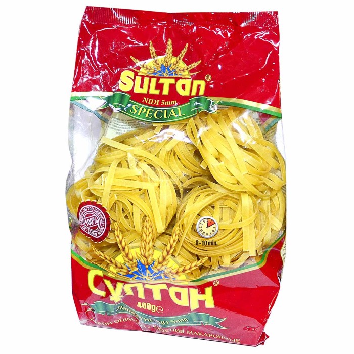Макаронные изделия ТМ "Султан" изготовлены из муки твёрдых сортов пшеницы с помощью лучшей технологии в мире и являются самыми высококачественными и экологически чистыми. Для производства настоящих макарон "группы А" используется мука твёрдых сортов пшеницы и вода.