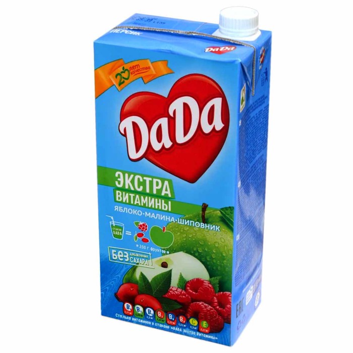 Нектар из яблок с экстрактами малины (листьев) и шиповника для детского питания “DADA ЭКСТРА-ВИТАМИНЫ” для детей дошкольного и школьного возраста от трех лет. Обогащенный витаминами. Без добавления консервантов и искусственных красителей. Пастеризованный. Без ГМО. Изготовлен из концентрированного сока. Минимальная объемная доля сока 50%. В одном стакане “DaDa Экстра-Витамины” Яблоко-Малина-Шиповник 200 мл столько же витаминов, как в 200 г микса яблок и экстрактов малины (листьев) и шиповника.