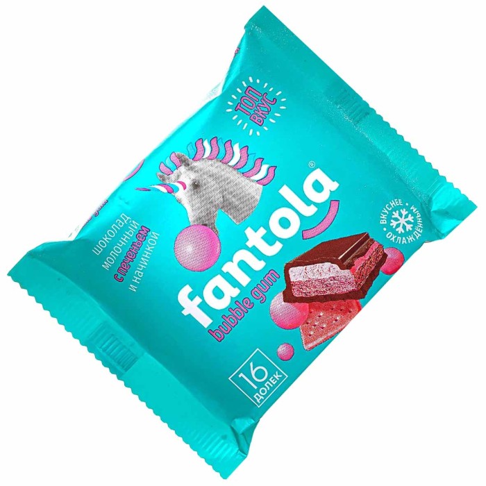 Топ-вкус! Хит продаж! Шоколад молочный Fantola – это настоящий молочный шоколад с начинкой с 4 потрясающими и необычными вкусами. 1.со вкусом жвачки "BUBBLE GUM" и ярким печеньем. 2.с начинкой и печеньем вкус "BLUE MALINA". 3.со вкусом "CHOCO VIBE" с начинкой и печеньем. 4.с начинкой со вкусом "AVOCADO-FEST" и печеньем . -Если бы единороги сами создавали шоколадки, они бы выглядели так — начинка со вкусом шоколада "BUBBLE GUM" , яркое печенье и нежный молочный шоколад. Сказочно вкусно! -В Fantola"BLUE MALINA" необычно всё. Малина здесь синяя, а печенье — розовое. Вот такая шоколадка с сюрпризом! -Шоколад молочный «CHOCO VIBE» с начинкой и печеньем, заряжает шоколадным настроением! Кроме нежного молочного шоколада внутри нее скрываются шоколадное печенье и шоколадная начинка. Чтобы тебе точно хватило шоколада, когда ешь нашу шоколадку! -Шоколад молочный «FANTOLA» с начинкой со вкусом «AVOCADO-FEST» и печеньем Что будет, если смешать вкус авокадо и фисташки? Уникальная начинка Fantola! Попробуй первую в