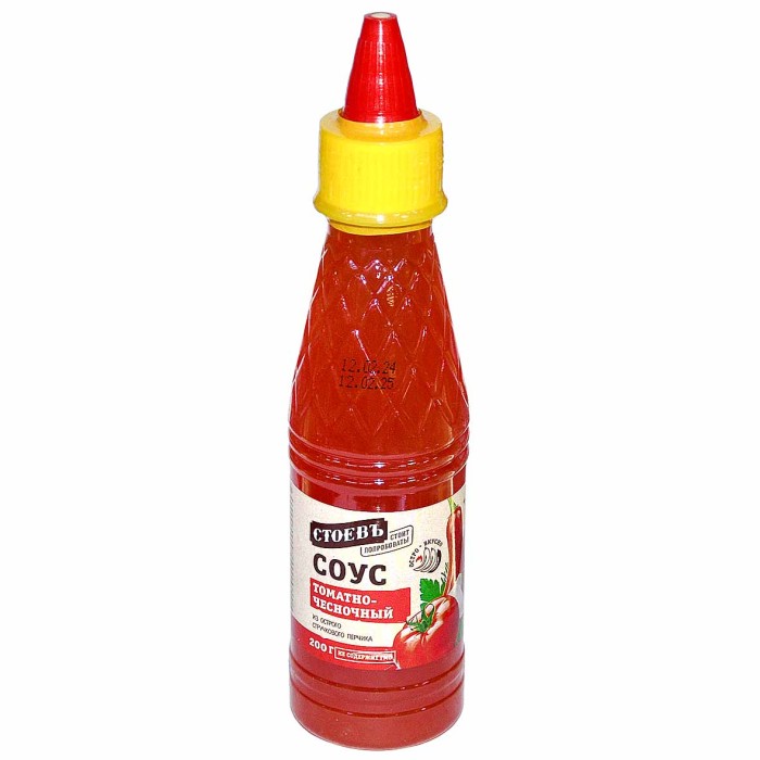 Состав: вода питьевая, сахар, перец стручковый острый сушеный, загуститель - крахмал кукурузный, соль поваренная пищевая, чеснок свежий, зелень укропа сушеная, зелень петрушки сушеная, регулятор кислотности – уксусная кислота, усилитель вкуса и аромата – Е621, ароматизатор Чеснок (вещество вкусоароматическое), регулятор кислотности –лимонная кислота, усилитель вкуса и аромата – Е631, Е627, загуститель –ксантановая камедь, консерванты – бензоат натрия, сорбат калия, красители – желтый «Солнечный закат» FCF, понсо 4R, подсластитель – Е 952, Е954.