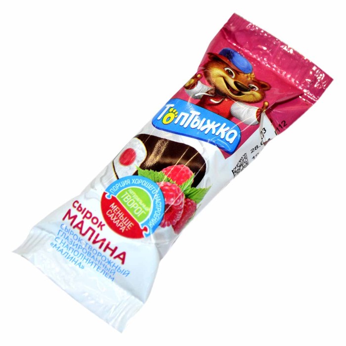 Состав: Творог, глазурь, сахар, наполнитель «Малина», масло сливочное. Состав глазури: кондитерская глазурь, какао-порошок, ароматизатор «Ванилин», масло кокосовое.